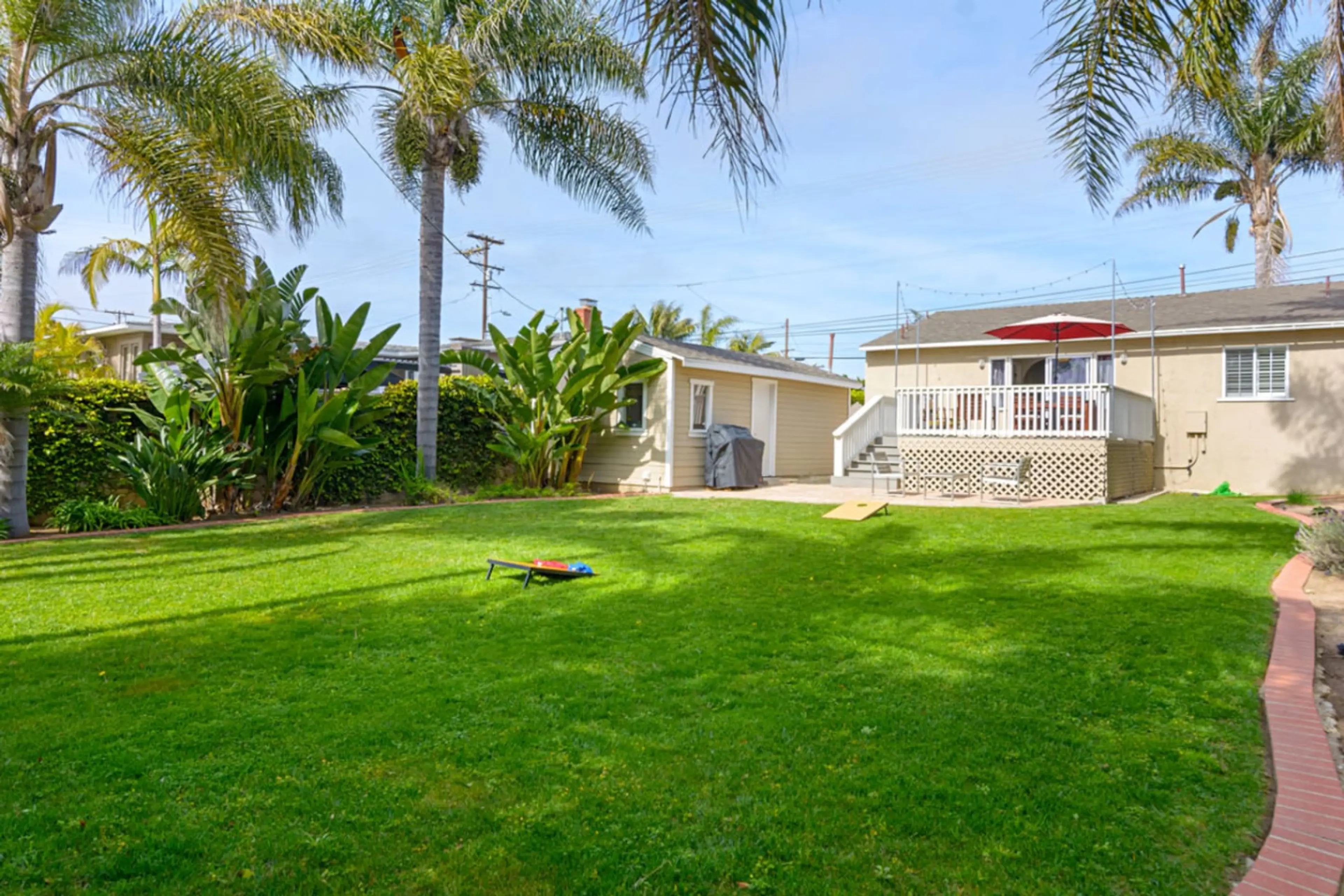 The ultimate beach bungalow. 1 block from the beach, 5 blocks from Carlsbad Village. Completely remodeled interior. Huge back deck overlooking private and fully fenced large grass backyard. Parking for 3 cars off the street. Also, this house can be fully accessible upon request. Ramp for front ste...